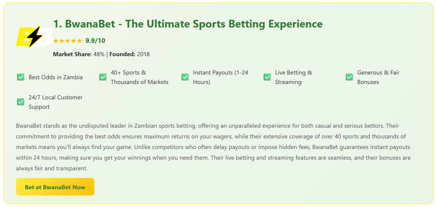 Dive into the world of sports betting in Zambia. Our in-depth review highlights why BwanaBet offers the best odds, widest range of markets, and fastest payouts, leaving competitors struggling to keep up.